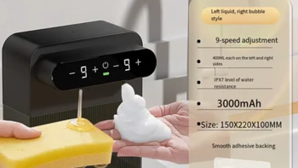 Два канала: Оснащен двумя независимыми резервуарами по 400 мл каждый (общая емкость 800 мл), что позволяет одновременно использовать разные типы моющих средств, например, жидкое мыло и пену. Сенсорный экран: Присутствует усовершенствованный сенсорный дисплей для управления настройками, включая регулировку уровня дозирования (9 уровней для каждой стороны). Увеличенная вместимость: Общая емкость 800 мл (2 x 400 мл) требует менее частого пополнения. Быстрая реакция: Использует интеллектуальную технологию инфракрасного датчика движения, которая срабатывает и выдает мыло всего за 0.02 секунды. Функция самоочистки: Чтобы предотвратить засорение и обеспечить оптимальную работу, дозатор имеет функцию автоматической очистки, которая активируется тройным нажатием кнопки питания в выключенном состоянии. Дополнительные характеристики: Устройство монтируется на стену для экономии места, имеет водонепроницаемость по стандарту IPX6 и перезаряжаемый аккумулятор емкостью 3000 мАч с быстрой зарядкой USB-C.