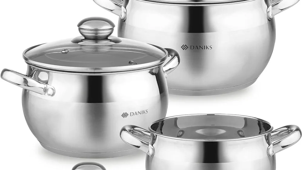 Набор из 6 кастрюль, подходящих для всех типов плит, включая индукционные, безопасных для мытья в посудомоечной машине, изготовленных из качественной нержавеющей стали, с крышками из закалённого стекла, сейчас всего за 218 шекелей с бесплатной доставкой до дома.
